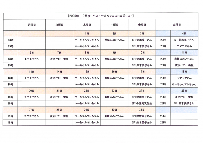 毎月15日を締切とし、局内で選考のうえ、翌月分の「ベストヒットリクエスト」放送リストを決定します。採用されたリストは、週1回または2回のペースで 1か月間放送します。あなたのリクエストが1時間まるまる番組になります!!