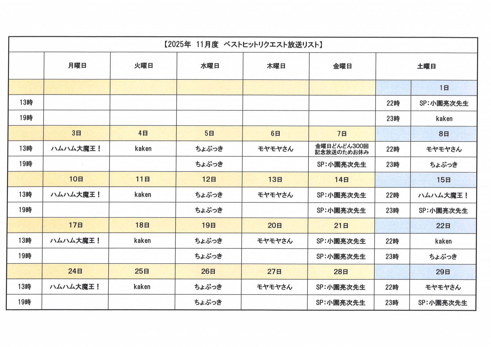 毎月15日を締切とし、局内で選考のうえ、翌月分の「ベストヒットリクエスト」放送リストを決定します。採用されたリストは、週1回または2回のペースで 1か月間放送します。あなたのリクエストが1時間まるまる番組になります!!