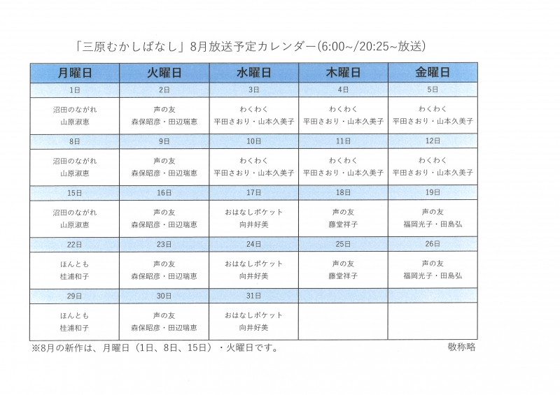 昔から伝わるお話を読み聞かせボランティアの皆さんのご協力により放送している番組です。三原の貴重なアーカイブスです。是非、お聴きください。