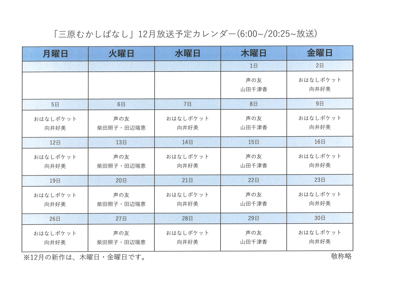 昔から伝わるお話を読み聞かせボランティアの皆さんのご協力により放送している番組です。三原の貴重なアーカイブスです。是非、お聴きください。