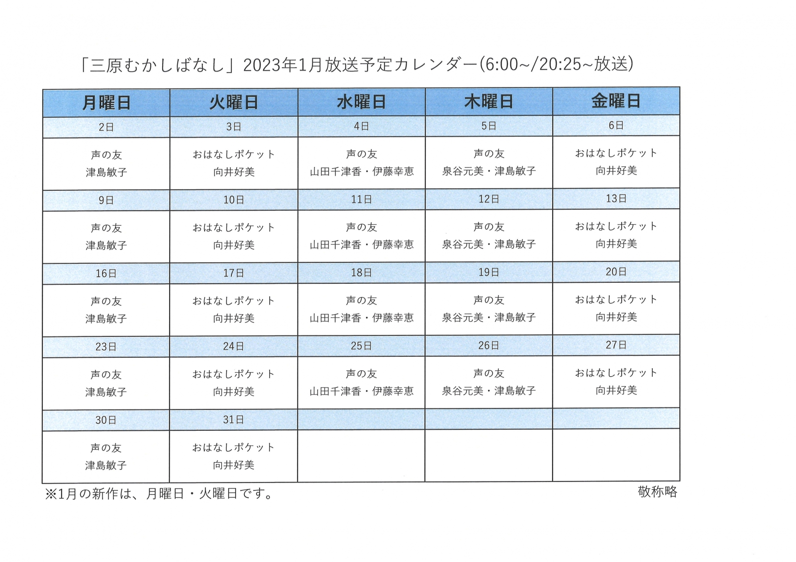 昔から伝わるお話を読み聞かせボランティアの皆さんのご協力により放送している番組です。三原の貴重なアーカイブスです。是非、お聴きください。