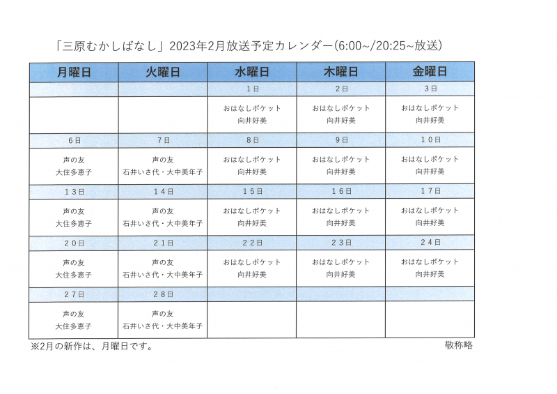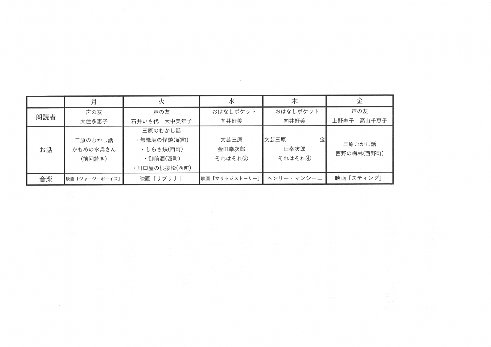 昔から伝わるお話を読み聞かせボランティアの皆さんのご協力により放送している番組です。三原の貴重なアーカイブスです。是非、お聴きください。