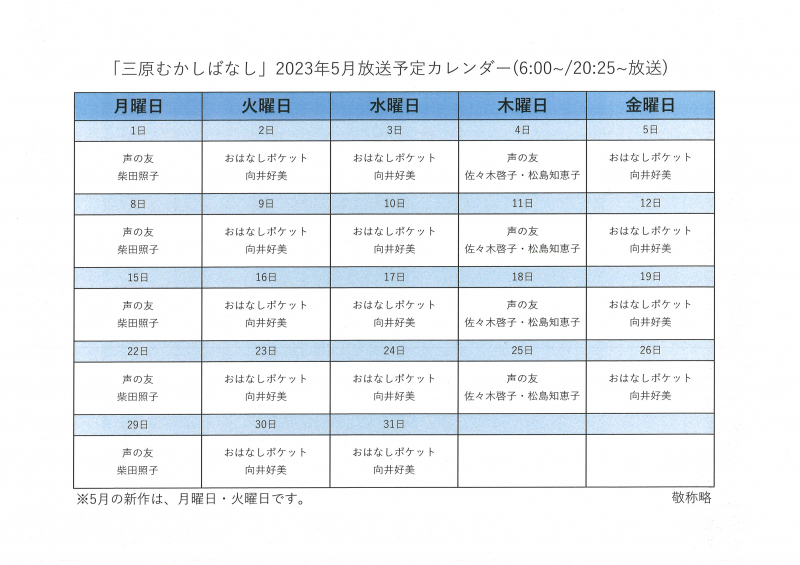昔から伝わるお話を読み聞かせボランティアの皆さんのご協力により放送している番組です。三原の貴重なアーカイブスです。是非、お聴きください。