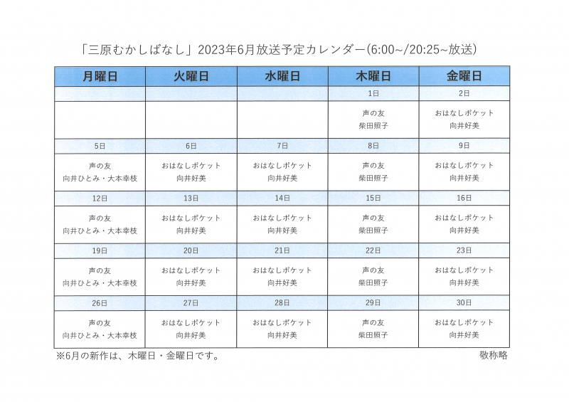 昔から伝わるお話を読み聞かせボランティアの皆さんのご協力により放送している番組です。三原の貴重なアーカイブスです。是非、お聴きください。