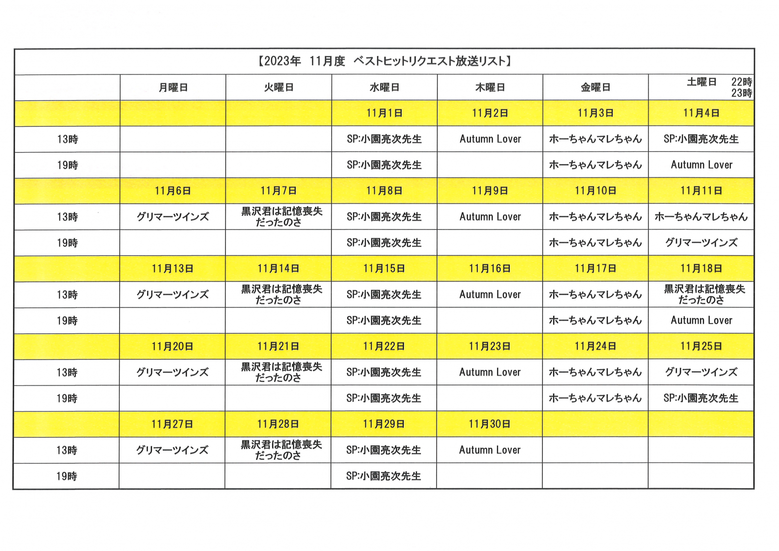 毎月15日を締切とし、局内で選考のうえ、翌月分の「ベストヒットリクエスト」放送リストを決定します。採用されたリストは、週1回または2回のペースで 1か月間放送します。あなたのリクエストが1時間まるまる番組になります!!