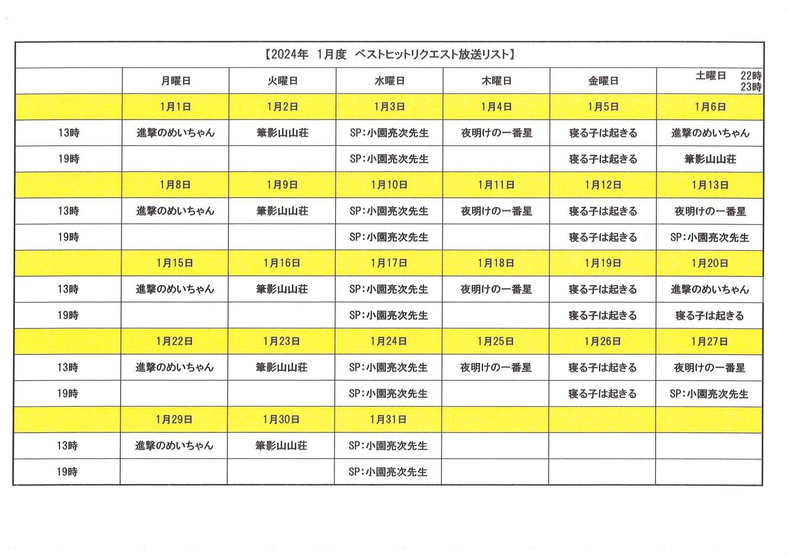 毎月15日を締切とし、局内で選考のうえ、翌月分の「ベストヒットリクエスト」放送リストを決定します。採用されたリストは、週1回または2回のペースで 1か月間放送します。あなたのリクエストが1時間まるまる番組になります!!
