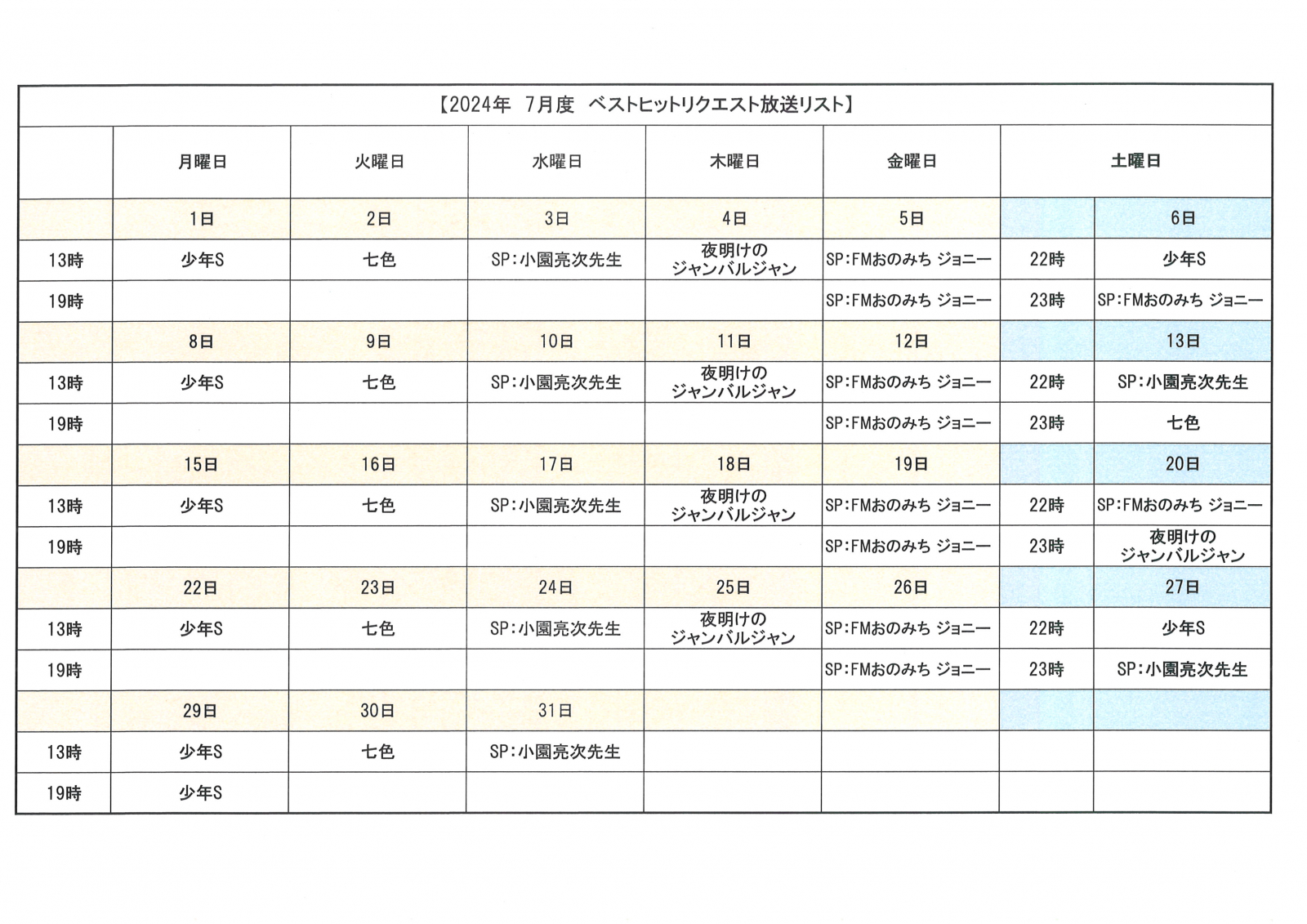 毎月15日を締切とし、局内で選考のうえ、翌月分の「ベストヒットリクエスト」放送リストを決定します。採用されたリストは、週1回または2回のペースで 1か月間放送します。あなたのリクエストが1時間まるまる番組になります!!