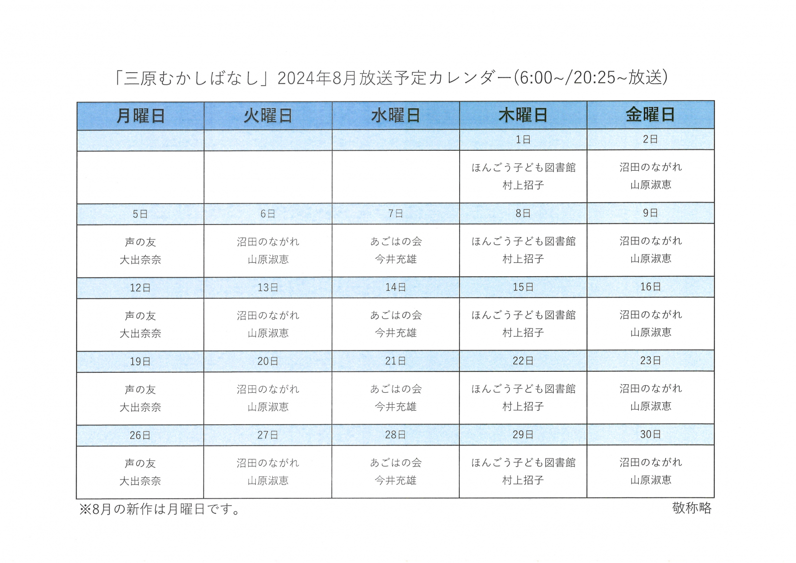 昔から伝わるお話を読み聞かせボランティアの皆さんのご協力により放送している番組です。三原の貴重なアーカイブスです。是非、お聴きください。