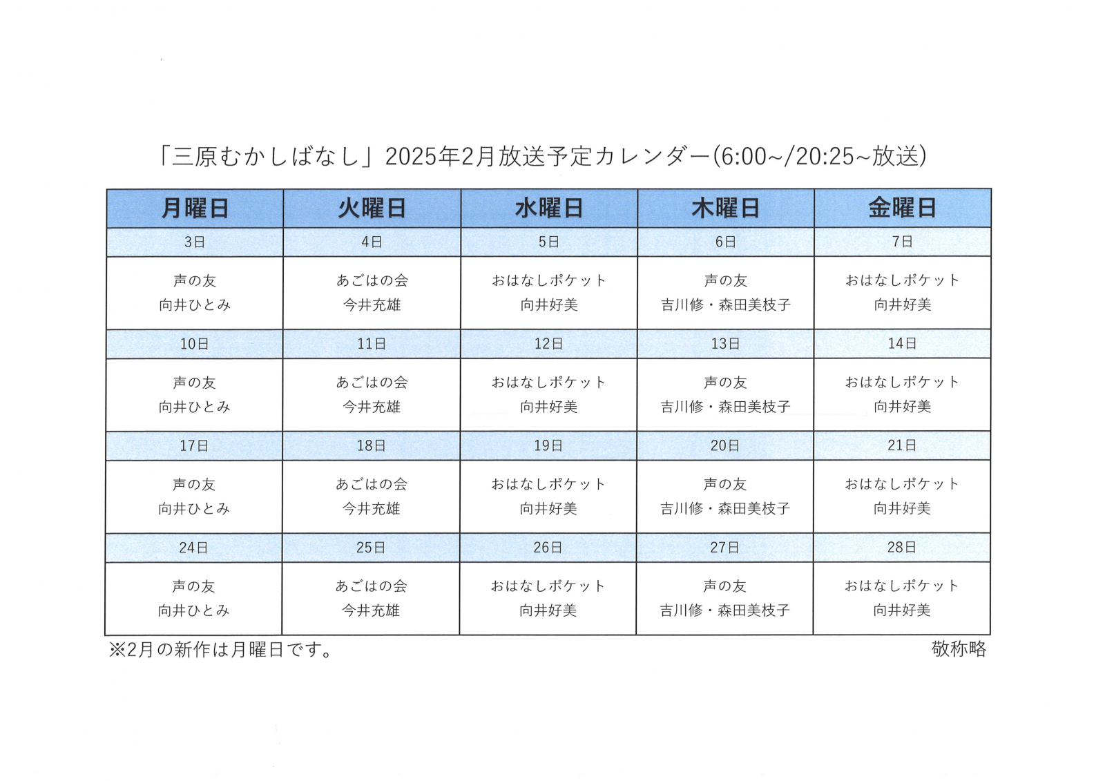 昔から伝わるお話を読み聞かせボランティアの皆さんのご協力により放送している番組です。三原の貴重なアーカイブスです。是非、お聴きください。