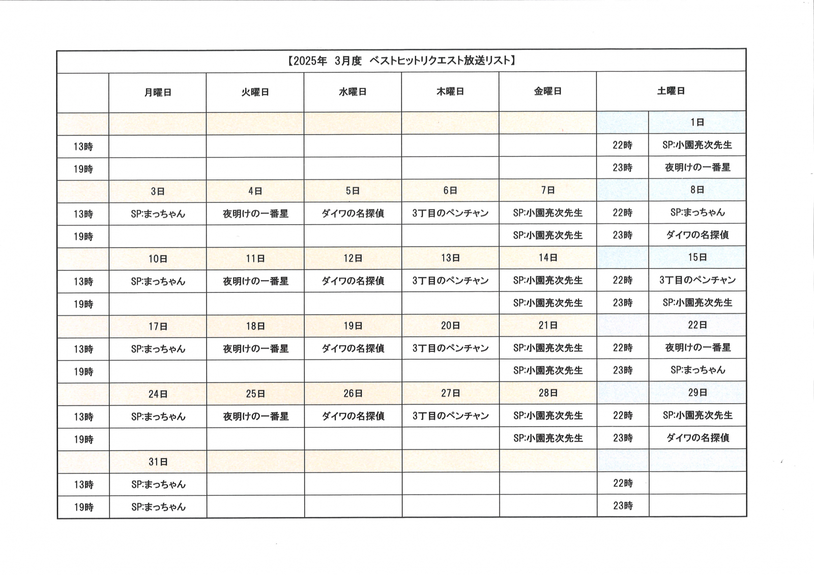 毎月15日を締切とし、局内で選考のうえ、翌月分の「ベストヒットリクエスト」放送リストを決定します。採用されたリストは、週1回または2回のペースで 1か月間放送します。あなたのリクエストが1時間まるまる番組になります!!