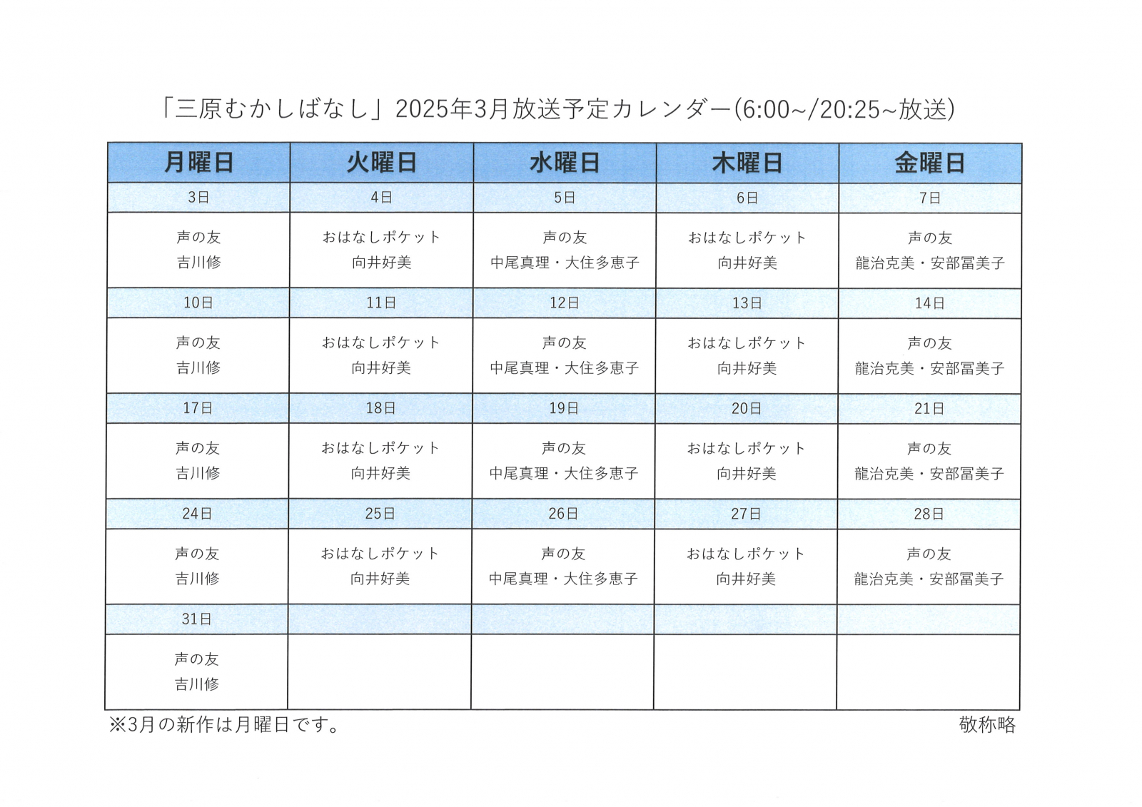 昔から伝わるお話を読み聞かせボランティアの皆さんのご協力により放送している番組です。三原の貴重なアーカイブスです。是非、お聴きください。
