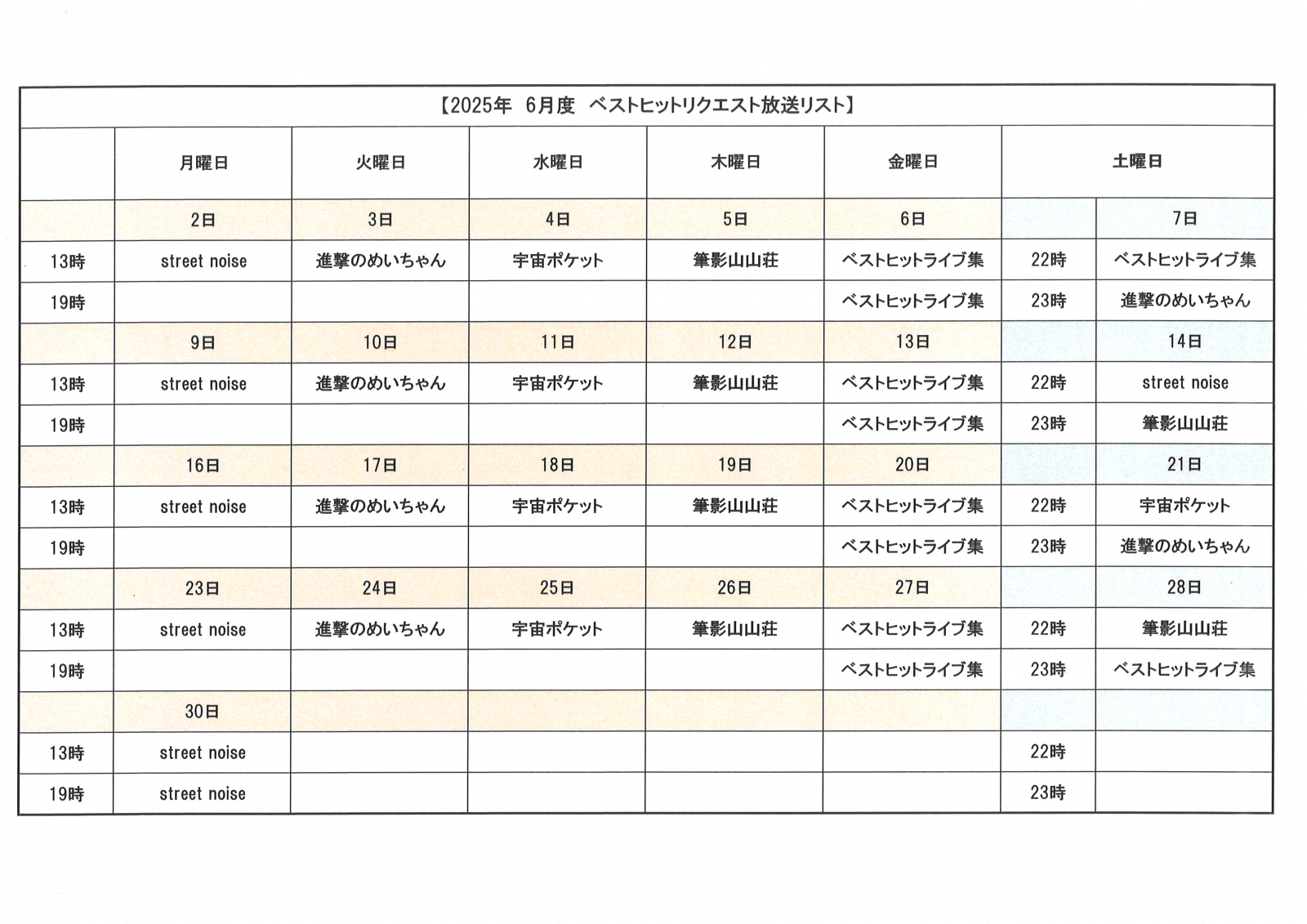 毎月15日を締切とし、局内で選考のうえ、翌月分の「ベストヒットリクエスト」放送リストを決定します。採用されたリストは、週1回または2回のペースで 1か月間放送します。あなたのリクエストが1時間まるまる番組になります!!