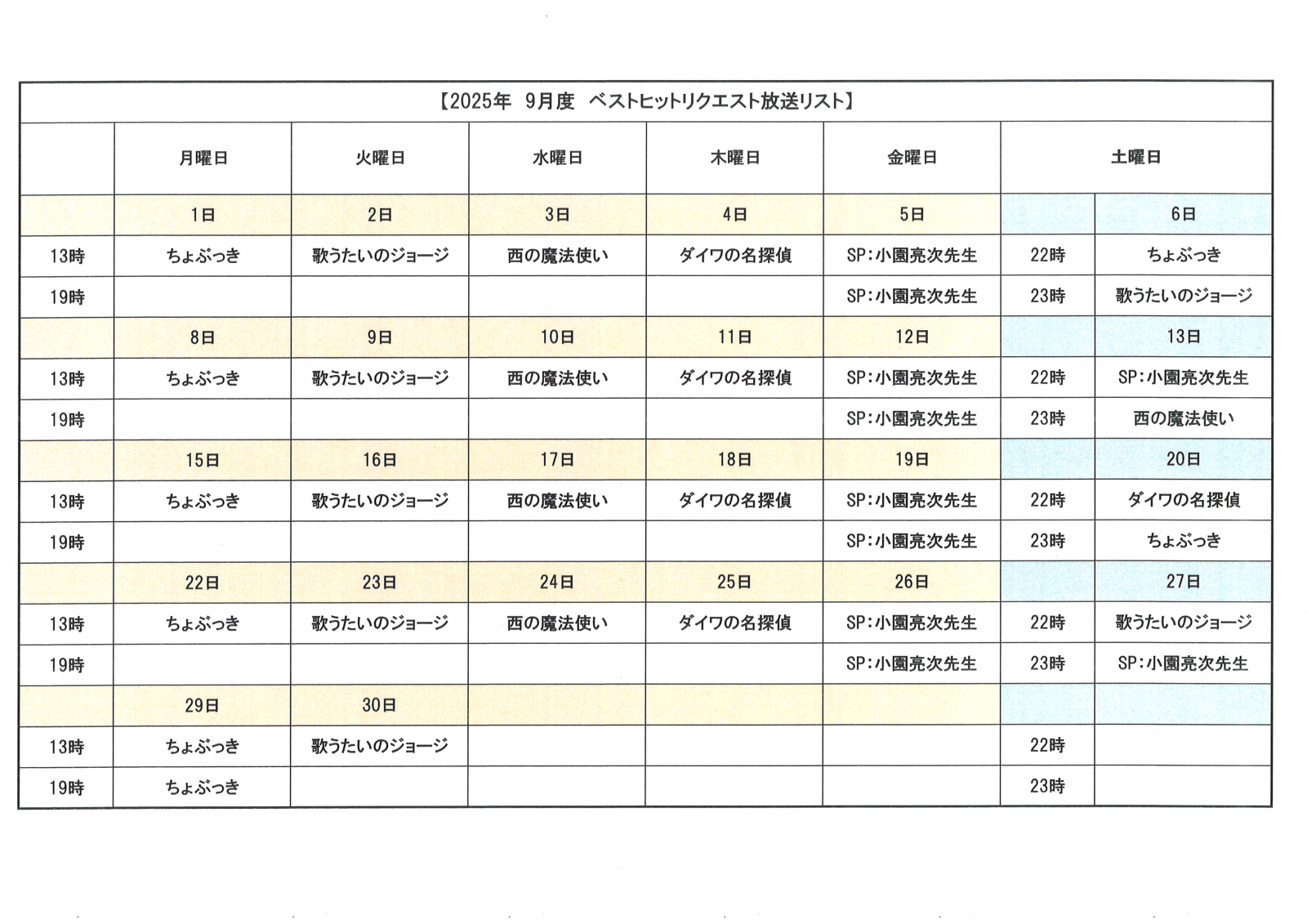 毎月15日を締切とし、局内で選考のうえ、翌月分の「ベストヒットリクエスト」放送リストを決定します。採用されたリストは、週1回または2回のペースで 1か月間放送します。あなたのリクエストが1時間まるまる番組になります!!