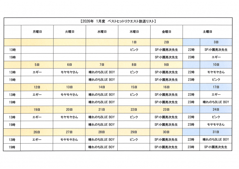 毎月15日を締切とし、局内で選考のうえ、翌月分の「ベストヒットリクエスト」放送リストを決定します。採用されたリストは、週1回または2回のペースで 1か月間放送します。あなたのリクエストが1時間まるまる番組になります!!