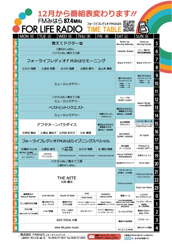 12月1日よりフォーライフレディオFMみはらは一部タイムテーブルを変更します。こちらの新しい番組表で12月1日より(一部11月30日より)放送を致します。みなさんに楽しく聴いて頂けるように今後も頑張って参りますので引き続き87.4MHzフォーライフレディオFMみはらをよろしくお願いします。