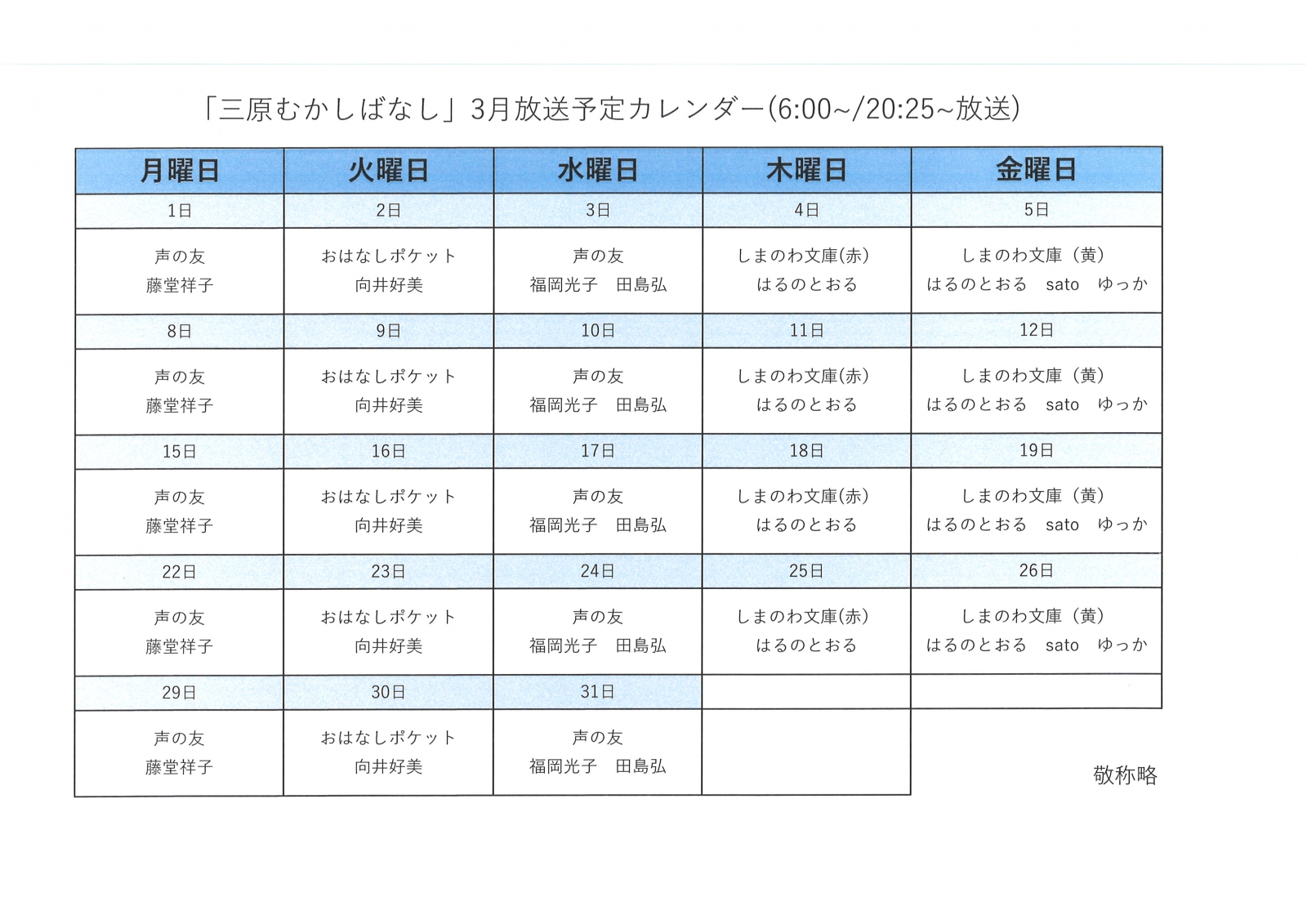 昔から伝わるお話を読み聞かせボランティアの皆さんのご協力により放送している番組です。三原の貴重なアーカイブスです。是非、お聴きください。