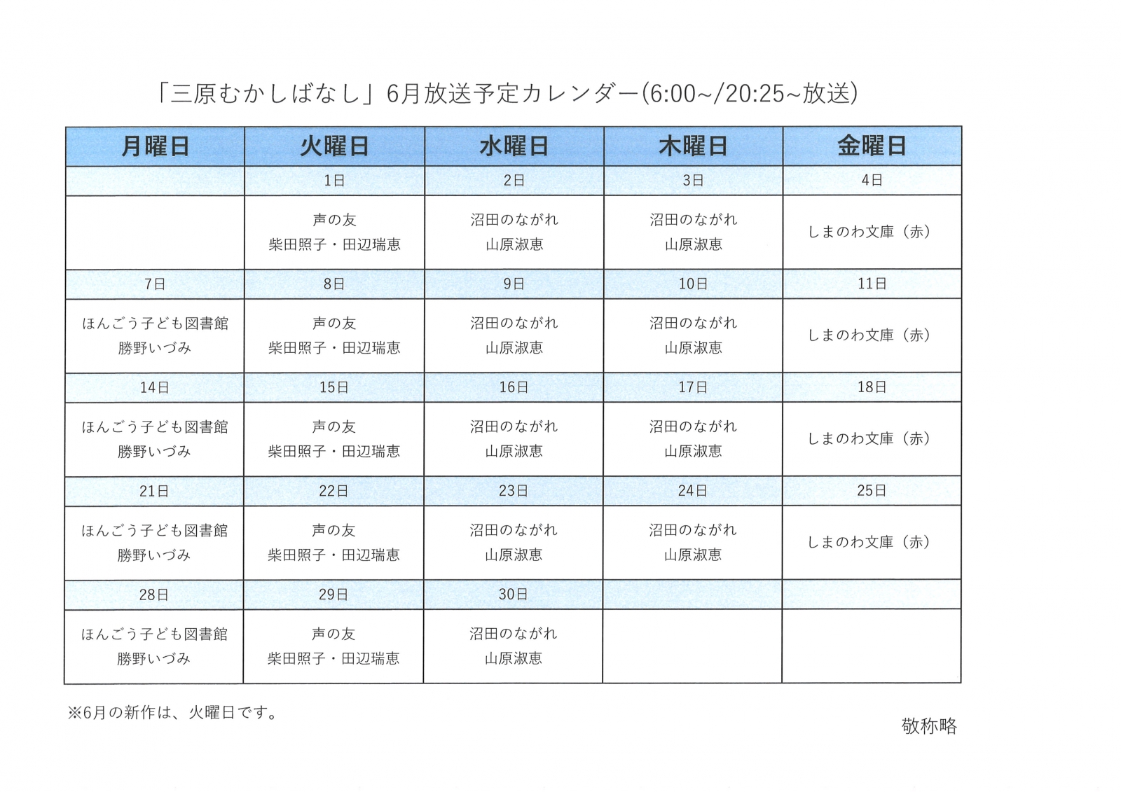 昔から伝わるお話を読み聞かせボランティアの皆さんのご協力により放送している番組です。三原の貴重なアーカイブスです。是非、お聴きください。