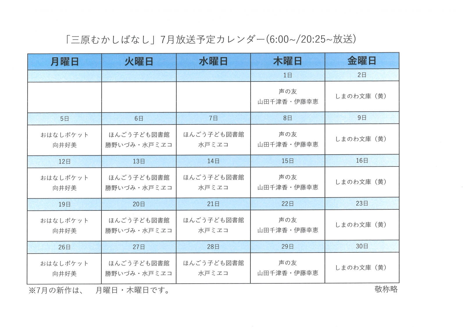 昔から伝わるお話を読み聞かせボランティアの皆さんのご協力により放送している番組です。三原の貴重なアーカイブスです。是非、お聴きください。
