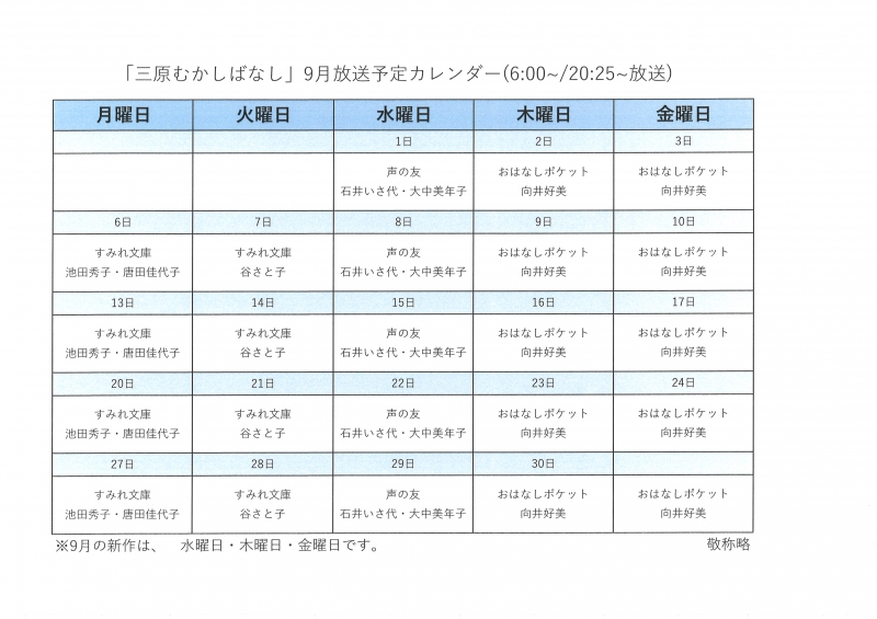 昔から伝わるお話を読み聞かせボランティアの皆さんのご協力により放送している番組です。三原の貴重なアーカイブスです。是非、お聴きください。