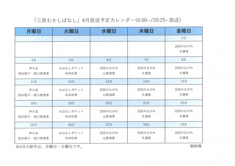 昔から伝わるお話を読み聞かせボランティアの皆さんのご協力により放送している番組です。三原の貴重なアーカイブスです。是非、お聴きください。
